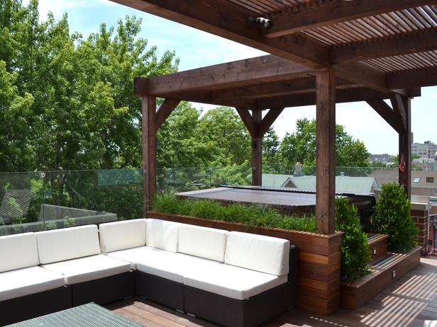 If you live in a windy spot or one prone to high rainfall, your best option may be an outdoor room like this one. Partly enclosing your outdoor space provides shelter, keeps in the warmth of any heating you may be using, and creates a sense of cosiness and privacy, making the space usable for a bigger part of the year.