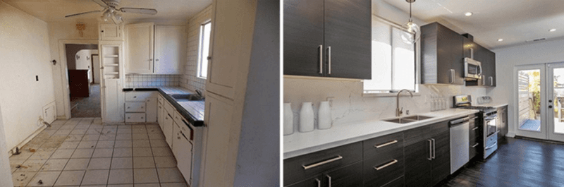 2: D. Here, a nasty, unworkable kitchen was replaced an elegant yet highly functional modern kitchen and opened up to the outdoor living area (see 1:G above – yep, it’s the same house).