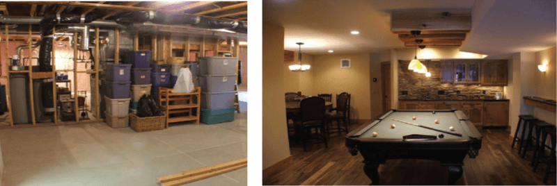 4: A. You may have had more trouble guessing this match. Before, the basement was only used for storage, a real waste of space. The homeowners decided to turn it into the perfect place for unwinding or entertaining, with beautiful results.