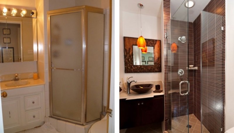 9: H. From a cramped, dank and dated bathroom to a haven of freshness and light. White paint and mirrors make this small space bigger and wall art, flowers and the antique chair add character to what otherwise may have seemed a somewhat sterile environment.